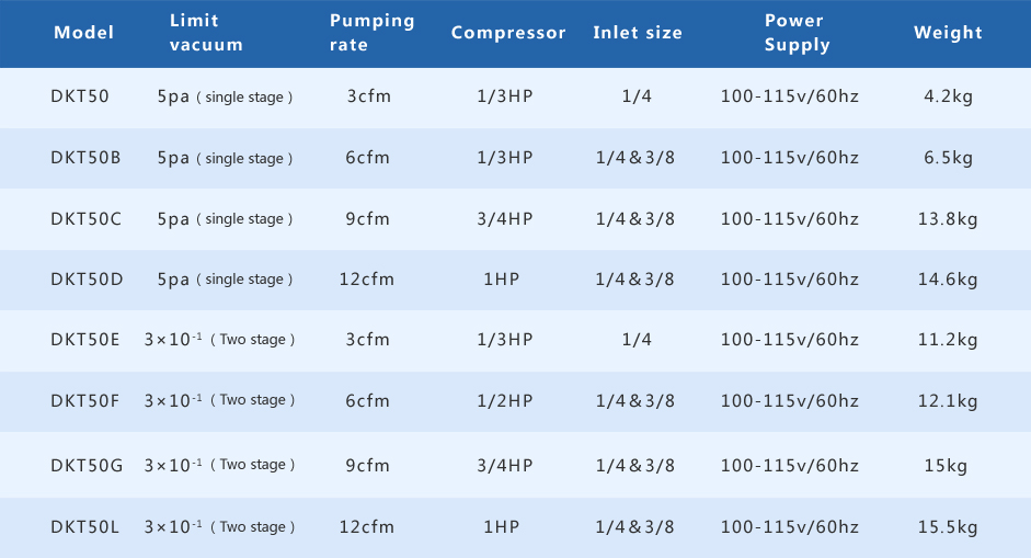 Dekaite DKT50 series industrial-grade vacuum pump is suitable for refrigeration maintenance, steam, ship, after-sales service and other places that need vacuum pumping. The equipment is light in weight and easy to carry.